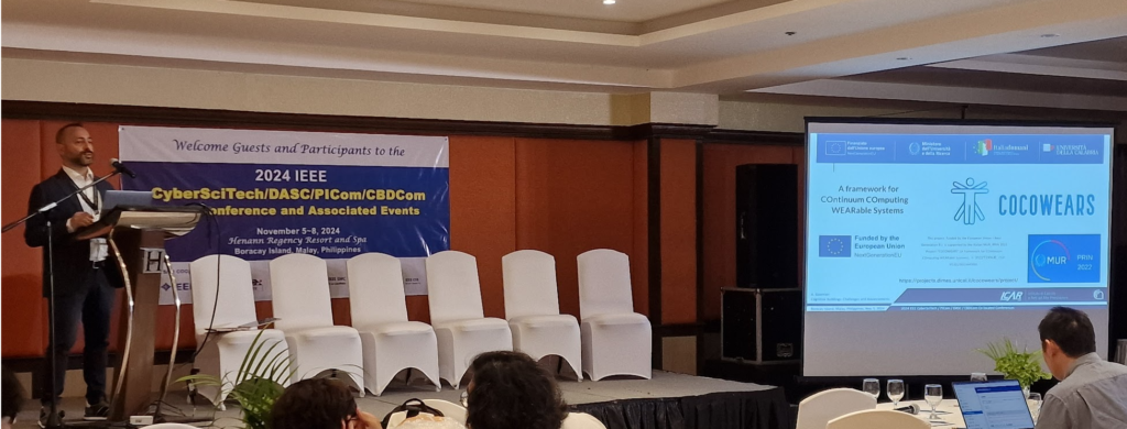 During the 2024 IEEE CyberSciTech / PICom / DASC / CBDCom Co-located Conferences, Dr. Antonio Guerrieri from ICAR-CNR participated in a panel of experts, held during a plenary session, where he presented the COCOWEARS project, highlighting its relevance to the conference themes. The conference, which took place on Boracay Island, Philippines, brought together leading researchers and professionals from around the globe to exchange ideas and address key challenges in technology and innovation.